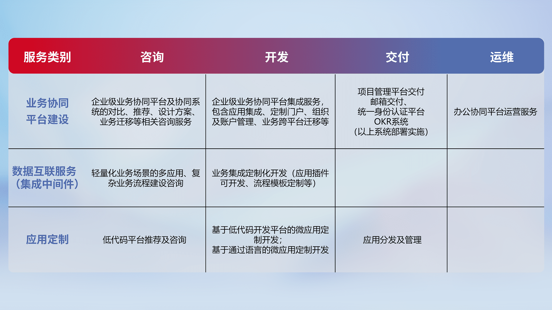 针对钉钉、、、、企微、、、、IDaas等平台级产品提供产品的规划、、、、方案、、、交付、、、、定制化开发等服务,,,,实现如统一协同办公、、、智能客户服务、、混合会议管理、、、、智能数据查询、、、、等业务场景,,,实现数字化转型。。。。