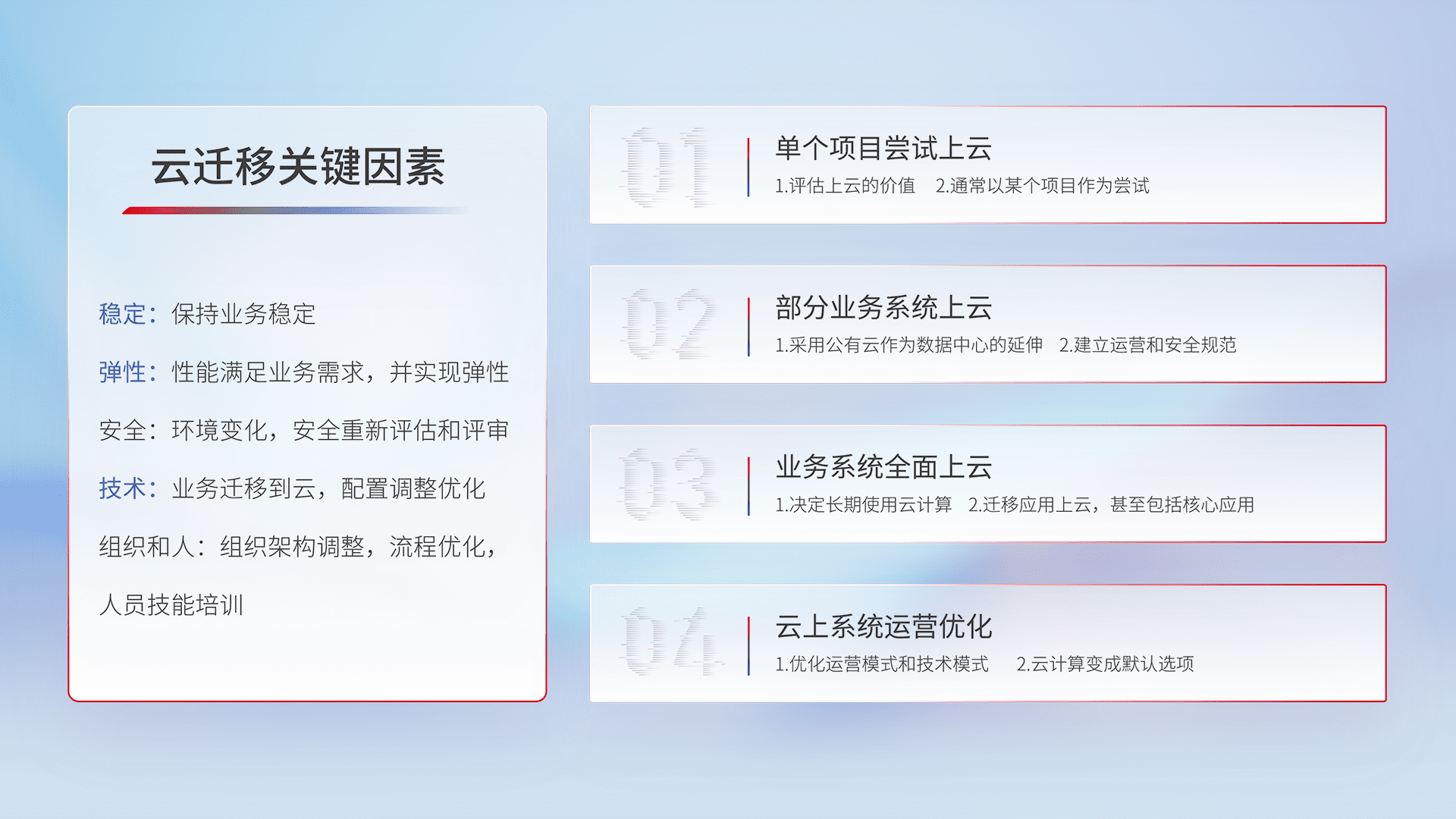 结合实际业务,,,,从规划设计、、、云平台选型、、、云原生改造、、、数据迁移、、集成交付,,,,迁移全过程为客户识别最佳上云路径,,,做好风险识别管理,,设计网络架构、、身份权限、、、安全审计合规、、操作审计、、日志审计、、监控告警策略、、、多站点容灾设计等,,,对云上基础设施进行整体规划,,,提升IT治理水平,,,以满足弹性、、、、高可用、、高性能的需求。。。